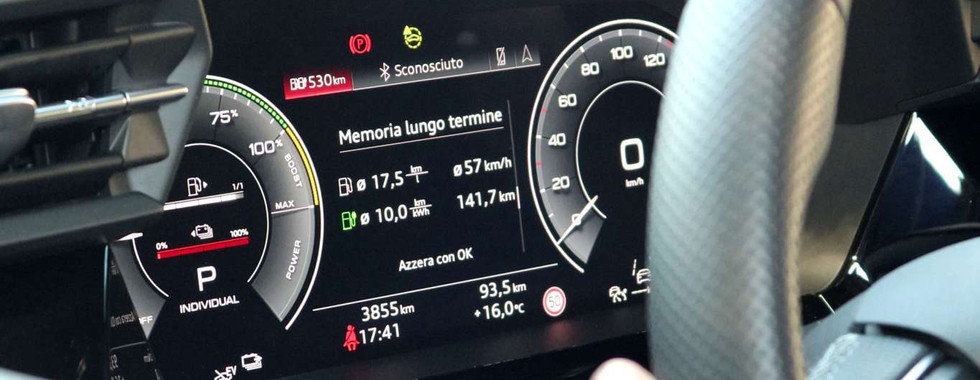 Viaggiando a benzina a batterie scariche A3 TFSI e si comporta come una normale auto full hybrid, con la modalità Auto che aiuta a contenere i consumi grazie alla funzione veleggio che si attiva quando rilasciamo il pedale dell’acceleratore a velocità costante. La media si attesta intorno ai 6 l di benzina per 100 km, con punte minime di 5 litri/100 km in città sfruttando la rigenerazione.