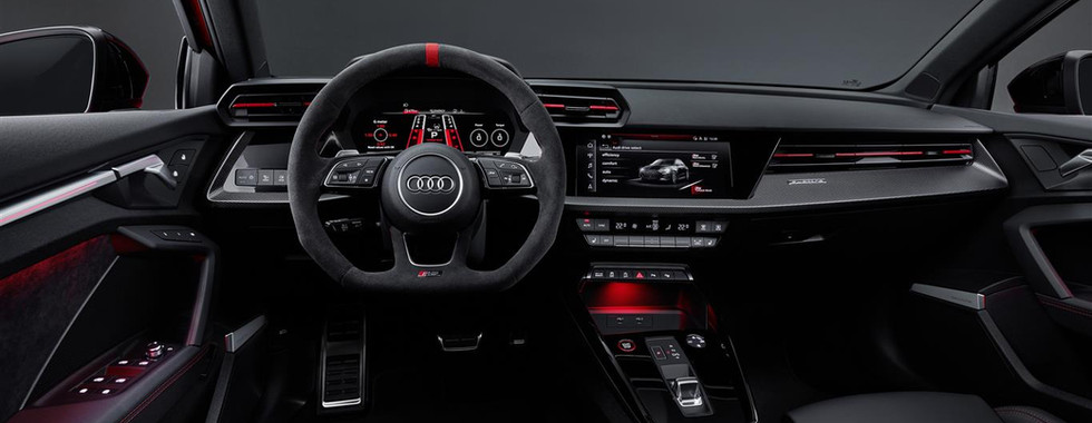 Dentro, l'abitacolo "spigoloso" di Audi A3 viene esaltato dagli inserti in fibra di carbonio sulla plancia (a richiesta), dai sedili anteriori sportivi RS con poggiatesta integrati, punzonatura RS e cuciture a contrasto in antracite. Alcuni tocchi di colore, nello specifico sulla corona del volante, sulle cinture di sicurezza, sui tappetini e sulla leva del cambio, vengono aggiunti dai pacchetti Design RS rosso o verde.