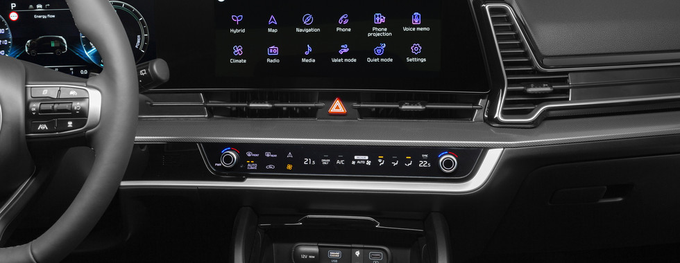 Gli interni di Kia Sportage in versione europea ricalcano quelli della variante globale, con un posto guida quasi completamente digitale dominato da un doppio display incastonato in un unico pannello con finitura lucida. Entrambi i pannelli hanno una diagonale di 12,3 pollici e rappresentano l'interfaccia dell'UVO Connect, integrato con servizi connessi che includono la gestione remota del veicolo tramite la nuova App dedicata.
