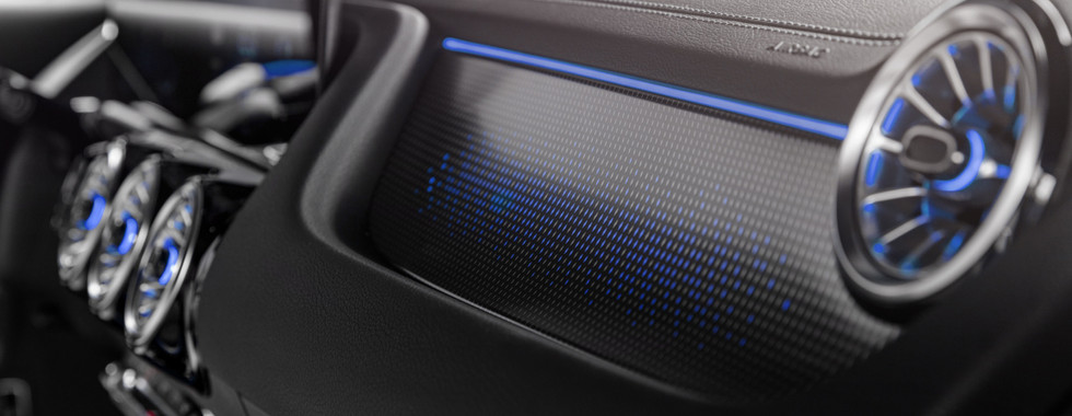 Ambiente elettrizzante anche all’interno, dove la plancia è pressoché identica a quella di GLA, anche se ci sono dei dettagli color oro rosé che rimandano al powertrain a elettroni. Inedito anche l’inserto retroilluminato davanti al passeggero anteriore.